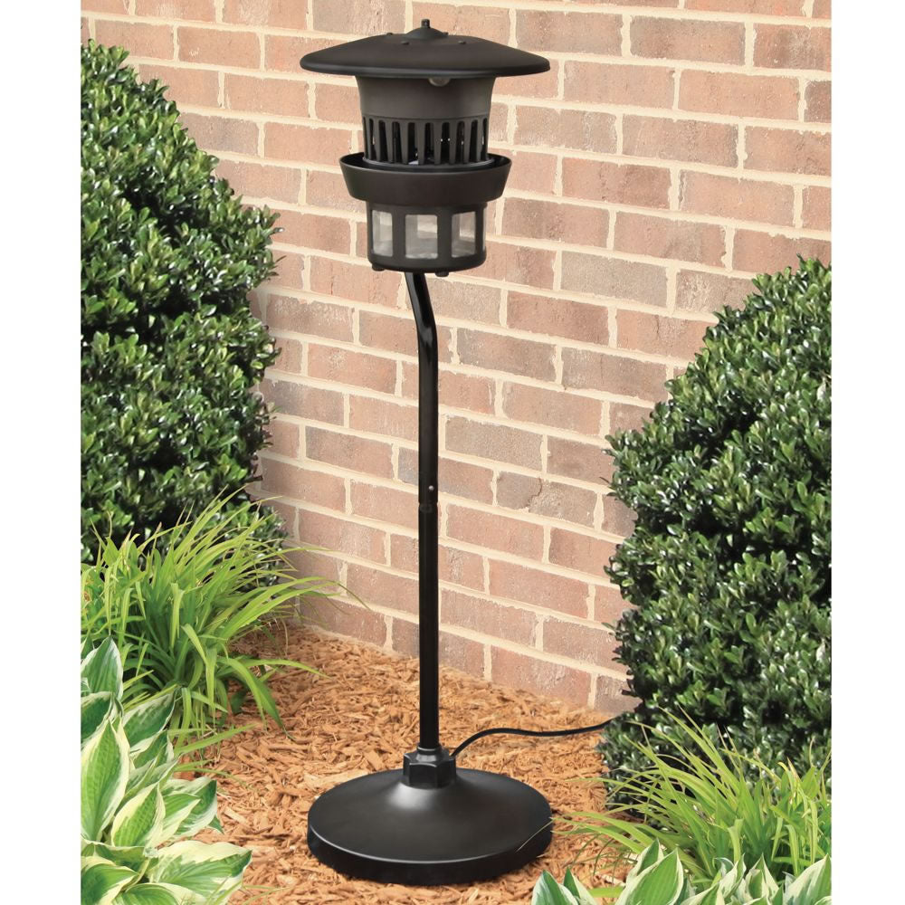 This trap attracts and kills mosquitoes across a half-acre without harmful chemicals. The trap emits odorless carbon dioxide (the same gas people expel during respiration), light, and collects rain water to lure mosquitoes. Carbon dioxide is generated when ultraviolet rays from the internal fluorescent bulbs react with a titanium dioxide coating inside the trap. When the mosquitoes are drawn inside the device, an integrated fan traps the insects and sends them to a removable compartment where they die of dehydration. Unlike propane systems that require frequent refills or electrocution traps that release pathogens when an insect is killed, this superior model uses 3,000-hour rated UV bulbs and does not create biological agents. Sets up on the included stand. Plugs into AC with 10' cord. 44" H x 13 1/2" Diam. (15 lbs.)
