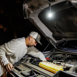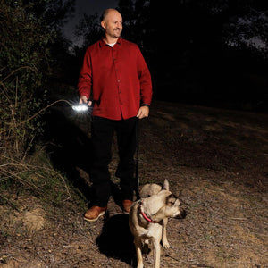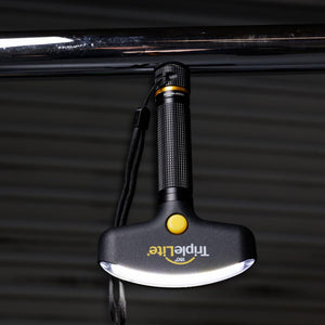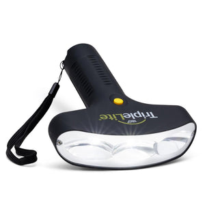 Unlike ordinary flashlights that only provide a 60 º wide beam, this unit has a patented design that produces a 180º wide beam. It has three LEDs that provide over 800 lumens of light for illumination during emergencies, camping, power outages, or walking pets. Made of durable ABS, the flashlight is rated to withstand drops of one meter and water resistant. Runs for eight hours. Includes three AA batteries. 7" L x 51/2" W x 11/2" D. (12 oz.)