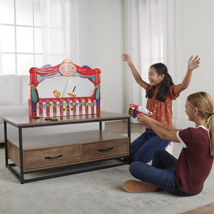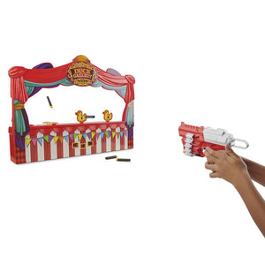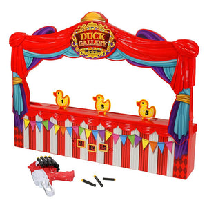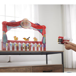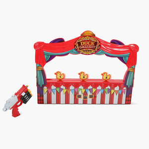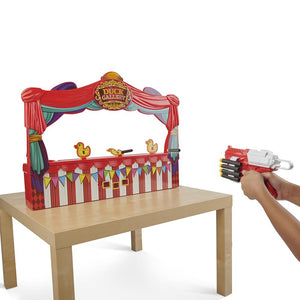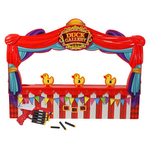 Inspired by the classic carnival arcade, this is the game that challenges players to blast moving ducks. A conveyor belt tests one’s marksmanship with a foam dart blaster as it carries six ducks from one end of the 3'-long gallery to the other. As players take aim, the game plays authentic carnival music and sound effects while an LED display counts down time and keeps score. With both a one- and two-player mode. Includes one blaster and 15 foam darts. Requires three C batteries. Ages 6 and up. Assembled 28" L x 21" W x 4" D. (7 lbs.)