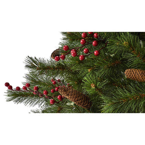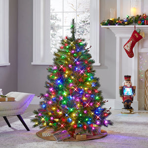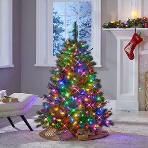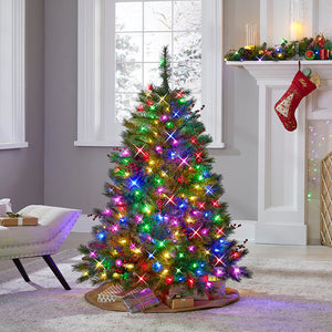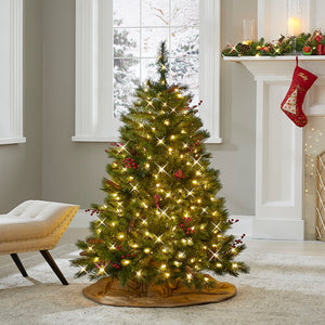 Only available from Hammacher Schlemmer, this is the 4 1/2' -tall prelit Christmas tree decorated with festive berries and lifelike pinecones. It has 438 branch tips that create lush, full foliage and is pre-decorated with 350 dual-color LED bulbs that seamlessly transfer from a warm white glow to multicolor illumination. A foot switch cycles through 10 different lighting options including fading and flashing effects. Nestled among its PVC branches are clusters of ruby-red berries and woody pinecones that together create the look and feel of a real conifer. The tree is comprised of three sections that lock into place and supply power through the center pole, eliminating the need to connect light cords. Includes metal stand. AC plug with 36" cord. 41" Diameter. (24 1/2 lbs.)