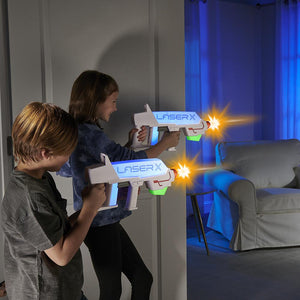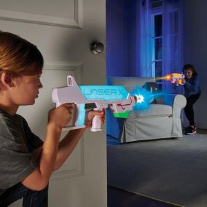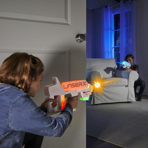 This is the superior laser tag set that allows two players to target each other with pinpoint accuracy from up to 500' away. Each blaster sends pulses of harmless infrared light that are detected by the opposing player’s blaster, which activates a color-changing LED to indicate a “hit”—eight successive “hits” ends the battle. The blasters “reload” 20 shots by cocking back the handle, enable rapid-fire, and have a built-in voice-coach. Requires six AAA batteries. Ages 6 and up.