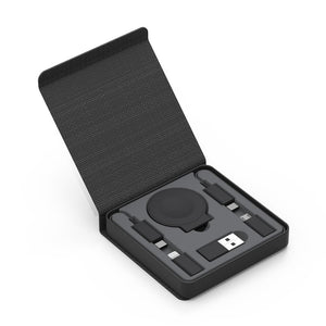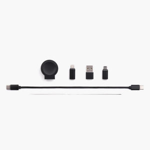 This is the portable charging kit that includes eight different cables, allowing one to recharge every type of device. Ideal for travel, it comes with the following cables: USB-C to USB-C, USB-C to smart watch charger, USB-C to USB-A, USB-C to Lightning, USB-C to micro-USB, USB-A to smart watch charger, USB-A to Lightning, and USB-A to micro-USB. It also includes a magnetic case that fits comfortably in a briefcase, backpack, or carry on. Select Apple Watch or Samsung Watch version. Black. 3" L x 3" W x 3/4" D. (4 oz.)