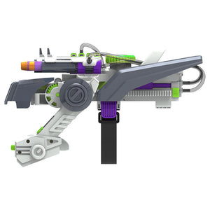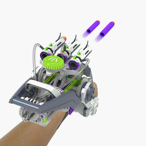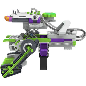 This is the building kit that lets children assemble a missile-launching glove. Using over 130 plastic pieces that snap and screw together, it forms a wrist blaster that adjusts to fit over almost any hand size and fires three foam darts in a row. Using only air pressure, children squeeze the trigger to release the darts at targets up to 10’ away. An included manual provides step-by-step instructions as well as experiments. Ages 10 and up. (1 1/2 lbs.)