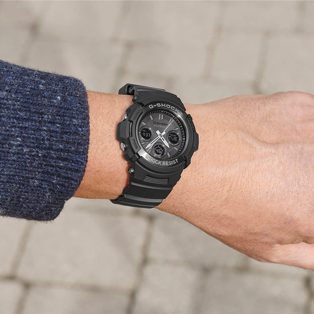 This is the atomic watch that will never be off by a second. It receives a radio signal up to six times a day from atomic clocks located in the U.S., Germany, England, Japan (two), and China—a timekeeping standard that neither gains nor loses a second in 80 million years. It has an automatic calendar, adjusts for daylight saving, and has a luminous coating on the hands and analog markings. The watch can also display time digitally in 12- or 24-hour format and has both an integrated timer and stopwatch. The watch recharges via a solar cell that is powered by both indoor and outdoor light. Water resistant up to 656'. Imported. Black or Black/Silver. Fits wrists from 53/4"-81/2". Watch case 2" L x 13/4" W x 1/2" D. (2 oz.)