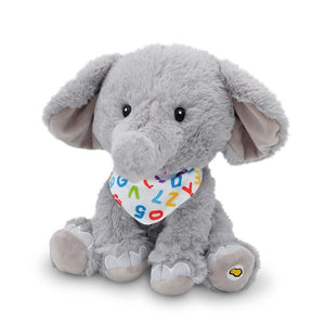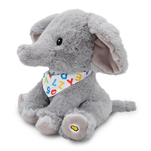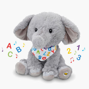 This is the animated plush elephant that wiggles and moves his ears as he sings the ABCs. A press of his foot prompts him into the ABC song or “Ten Little Elephants” while he moves in synchronization with the lyrics. His colorful bandana enhances his enthusiastic rendition of the classic kid’s tunes and his soft polyester body makes him perfect for hugs and cuddles. Includes three AA batteries. Ages 24 months and up. 12" H x 8" W x 9" D.