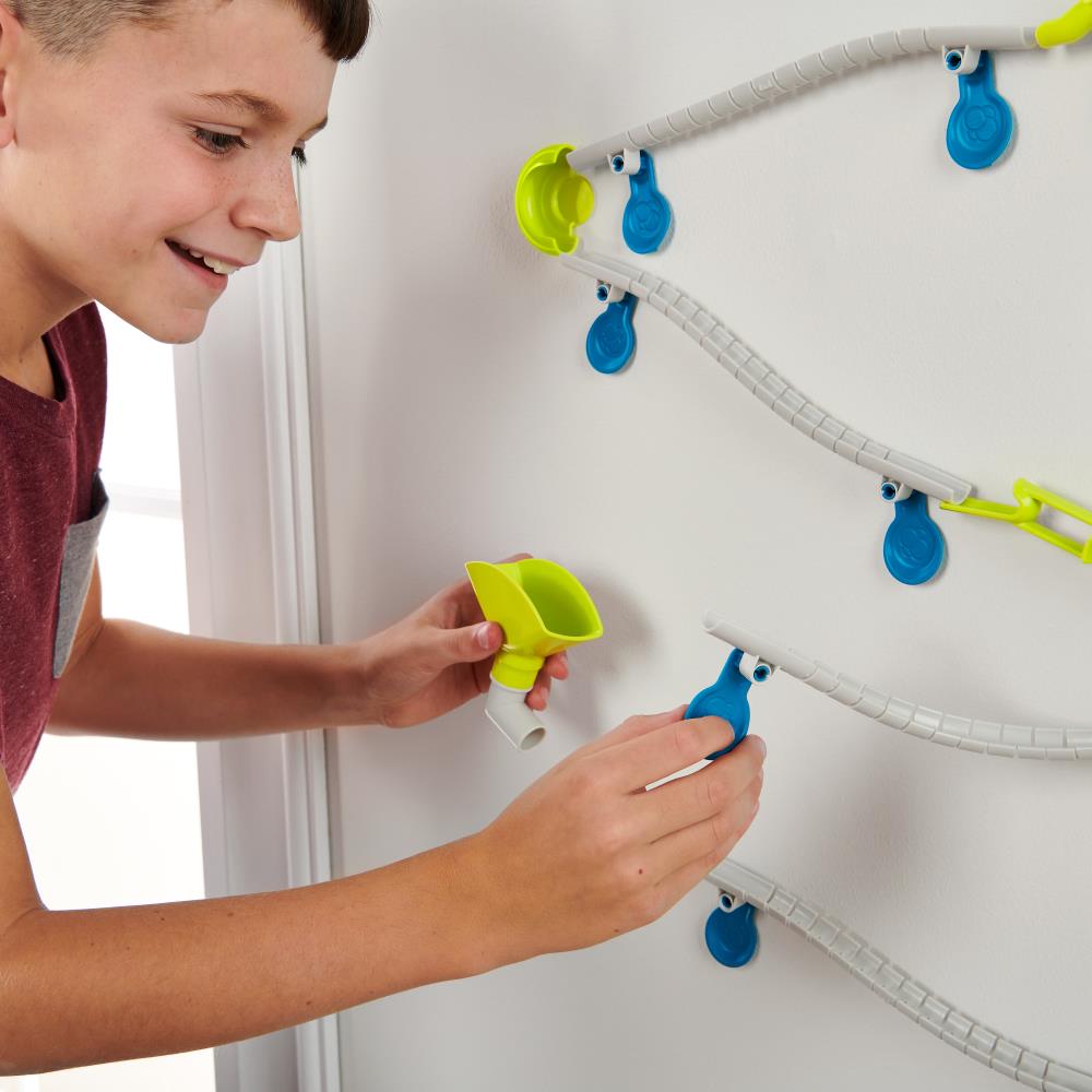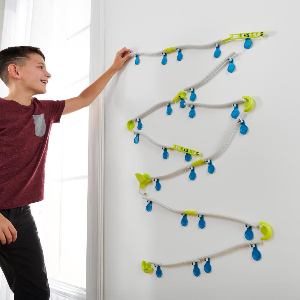 This is the marble roller coaster kit that allows children to design and build a descending track that attaches to a wall, door, window, cupboard, or any other smooth vertical surface. The set includes seven metal marbles that ride the run through steep drops, hairpin turns, jumps, twists, ricochets, and more. The various components can be assembled in countless configurations without marring surfaces and the marble run roller coaster can be expanded with additional components (sold separately). The kit contains 12 flexible track pieces, four track turns, two levers, a funnel, and a switch that adheres to a surface using the 27 included adapters and nano-adhesive pads. Winner of a 2024 ASTRA Play Award, the kit is crafted in Germany and comes with a manual that provides step-by-step instructions as well as building challenges. Ages 8 and up. (11/2 lbs.)