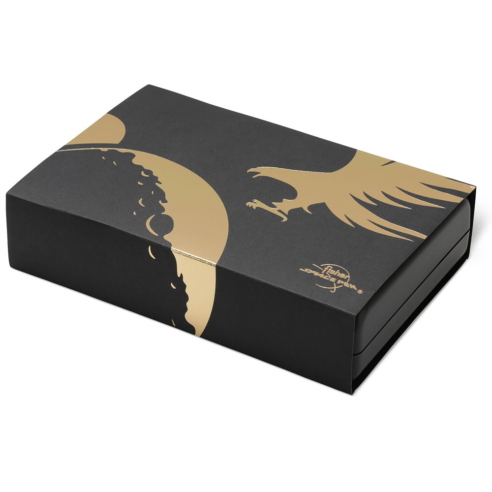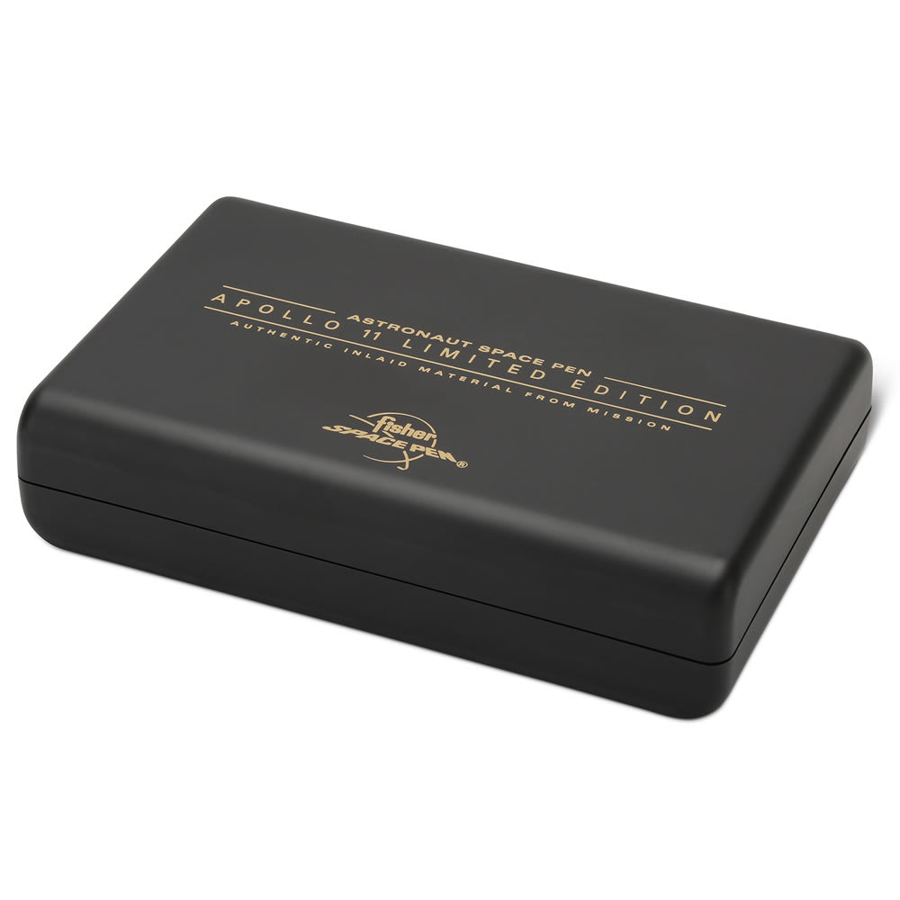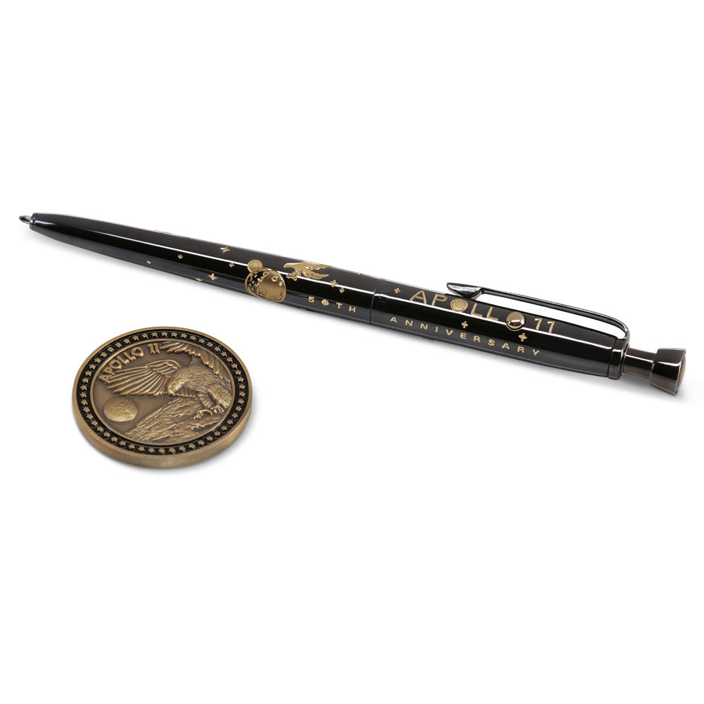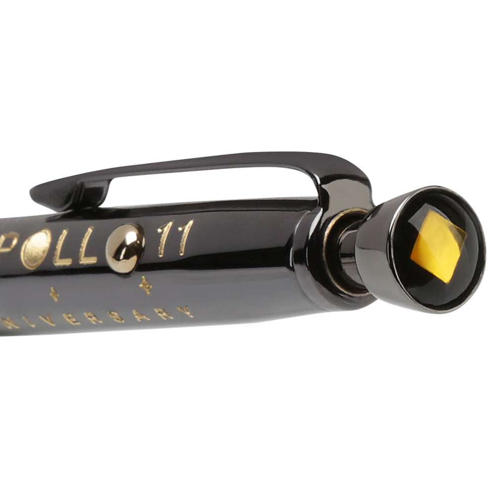 This is the commemorative Fisher AG-7 Space Pen that contains a piece of genuine Kapton polyimide tape recovered from Columbia, Apollo 11’s Command Module. Preserved within a transparent acrylic dome sealed into the pen’s cap that displays its gold (down) side, the square of Kapton tape—an authentic artifact that actually travelled to the Moon and back—was removed from Columbia’s thermal protection shield by former Rockwell Space Division recovery team member O.W. Nasse in August 1969. The pen that accompanied Apollo astronauts into space, the AG-7 today uses the same thixotropic ink sealed in a pressurized cartridge to enable writing in temperatures from -30º F to 250º F, underwater, at any angle (even upside down), and in zero gravity. The black titanium nitride-finished brass barrel has 24-karat gold-plated engravings celebrating Apollo 11’s historic achievement. Ultra-hard tungsten carbide ball writes a medium line in black ink. With commemorative coin. 5.06" long. Signature required for delivery.