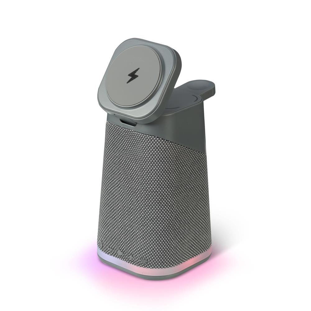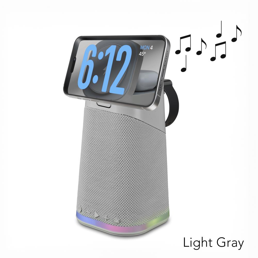 This is the Apple device charging tower that simultaneously supplies power to an iPhone, Apple Watch, and a set of Airpods. Using Magsafe technology, the tower contains a module that wirelessly charges an iPhone 12 or above (with 15W fast charge). A second 15W charging pad flips up on the side to supply power to an Apple watch while a third wireless 5W charging pad accommodates AirPods or other Qi-enabled devices. The unit adjusts power flow automatically to maximize charging efficiency and minimize charging times. The charging tower also functions as a Bluetooth speaker, streaming audio from a paired device from up to 100’ away. With a dimmable LED base and versatile portrait/landscape charging. AC adapter. Select Dark Gray or Light Gray. 6 1/2" H x 3 1/2" W x 3 1/2" D. (1 3/4 lbs.)