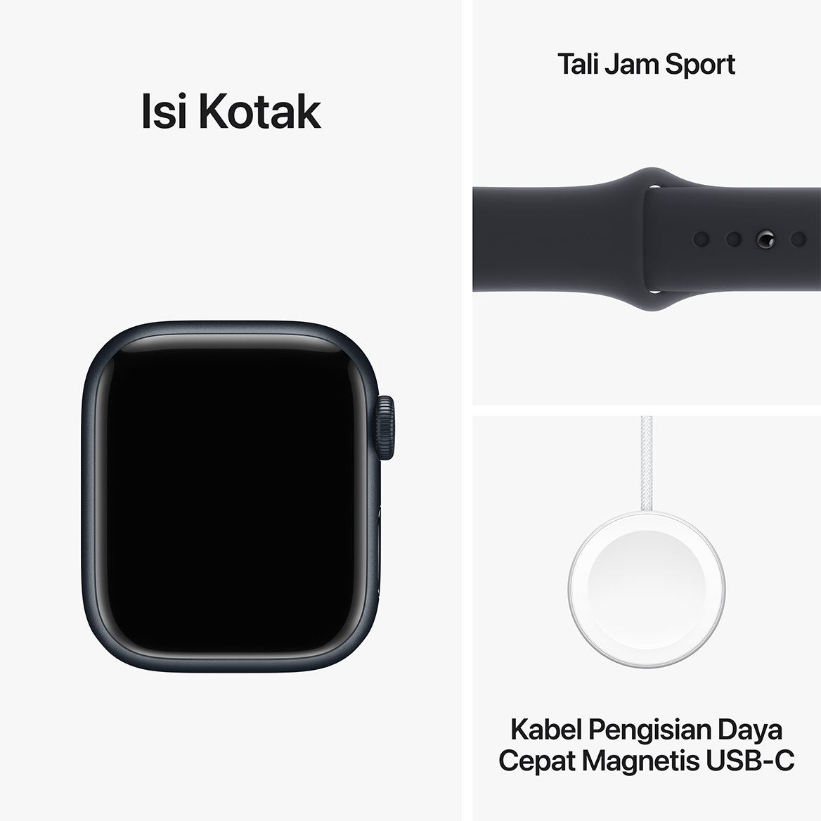- TETAP TERHUBUNG—Kirim teks, terima telepon, dengarkan musik dan podcast, dan dapatkan pemberitahuan di mana saja. Apple Watch Series 9 (GPS) berfungsi dengan Wi-Fi atau iPhone Anda agar Anda tetap terhubung.
