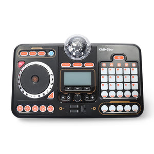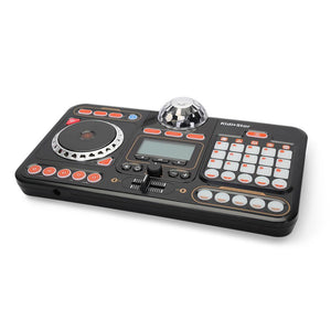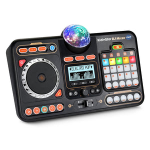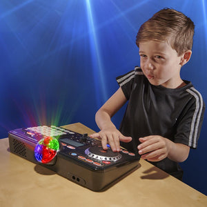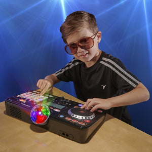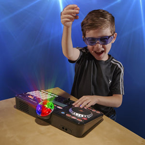 This is the mixing station that lets young DJs easily create custom tracks with turntable scratch pad effects and other audio flourishes. Children can play along with the 15 built-in songs or with their own tunes using a wireless Bluetooth or audio cable connection. The mixing board allows kids to play different instruments, apply sound effects, change tempos, and more to create 2,000+ rhythms, plus add scratching effects with the turntable. An internal microphone records custom sound effects and samples, and music mash ups can be played through an external speaker or your own headphones. A built-in disco ball adds a party vibe with dazzling lights. Requires four AA batteries. Ages 5 and up. 14 1/2" L x 9 1/4" W x 3 3/4" D. (5 1/4 lbs.)