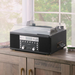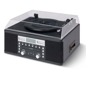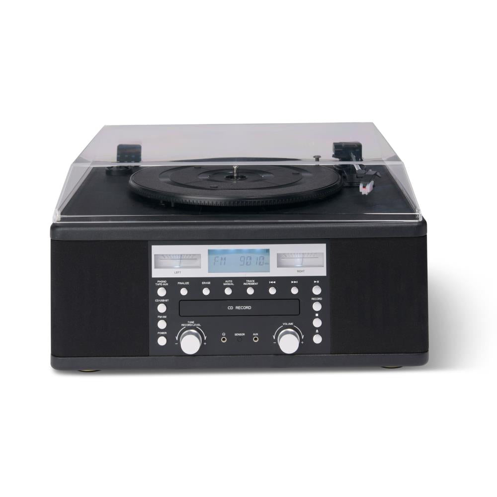 This is our stereo system that preserves classic records and cassettes by converting them to CDs with enhanced quality and clarity. It faithfully transfers LPs or cassettes to digital audio CD-R/RW with enhanced clarity, employing advanced signal-to-noise ratio technology that eliminates unwanted static and background noise. A USB connector allows direct recording to a PC from vinyl, cassettes, or live radio broadcasts. The versatile system plays 33s, 45s, and 78s through two 4-watt speakers, while also offering cassette playback, a built-in AM/FM stereo with digital tuner, and single CD player. Includes remote control. AC adapter. 141/4" D x 17" W x 91/4" H. (18 lbs.)