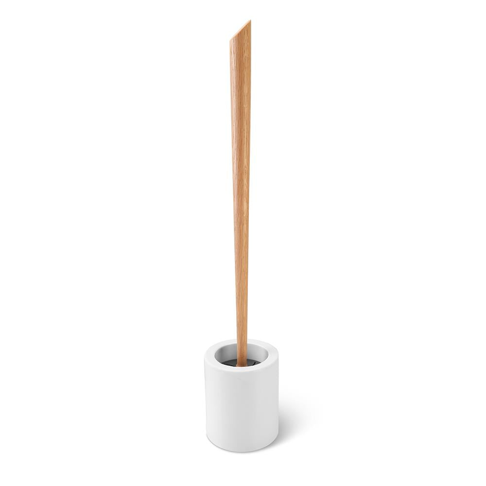 This is the toilet brush with a handle 6" longer than those that can be commonly found elsewhere, decreasing the amount of bending and effort one must exert to properly clean a commode. Made in Germany, its oak handle terminates in a cleaning head formed by eight wavy thermoplastic elastomer paddles that act like a conventional brush without the need to bend and stoop over a toilet to apply enough pressure for cleaning. The cleaning head also resists microbes. Includes a ceramic holder. 22" L.