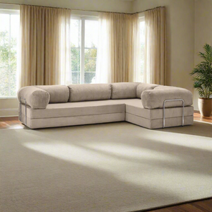 Discover the comfort of our new l-shaped modular sofa. designed with a focus on cosy lounging and stylish relaxation. Wrapped in premium corduroy fabric with robust durability. making it a standout piece in any room. The included three chrome-plated iron bars add a sleek touch and reinforce the frame for enhanced stability.