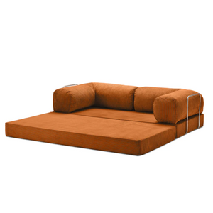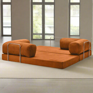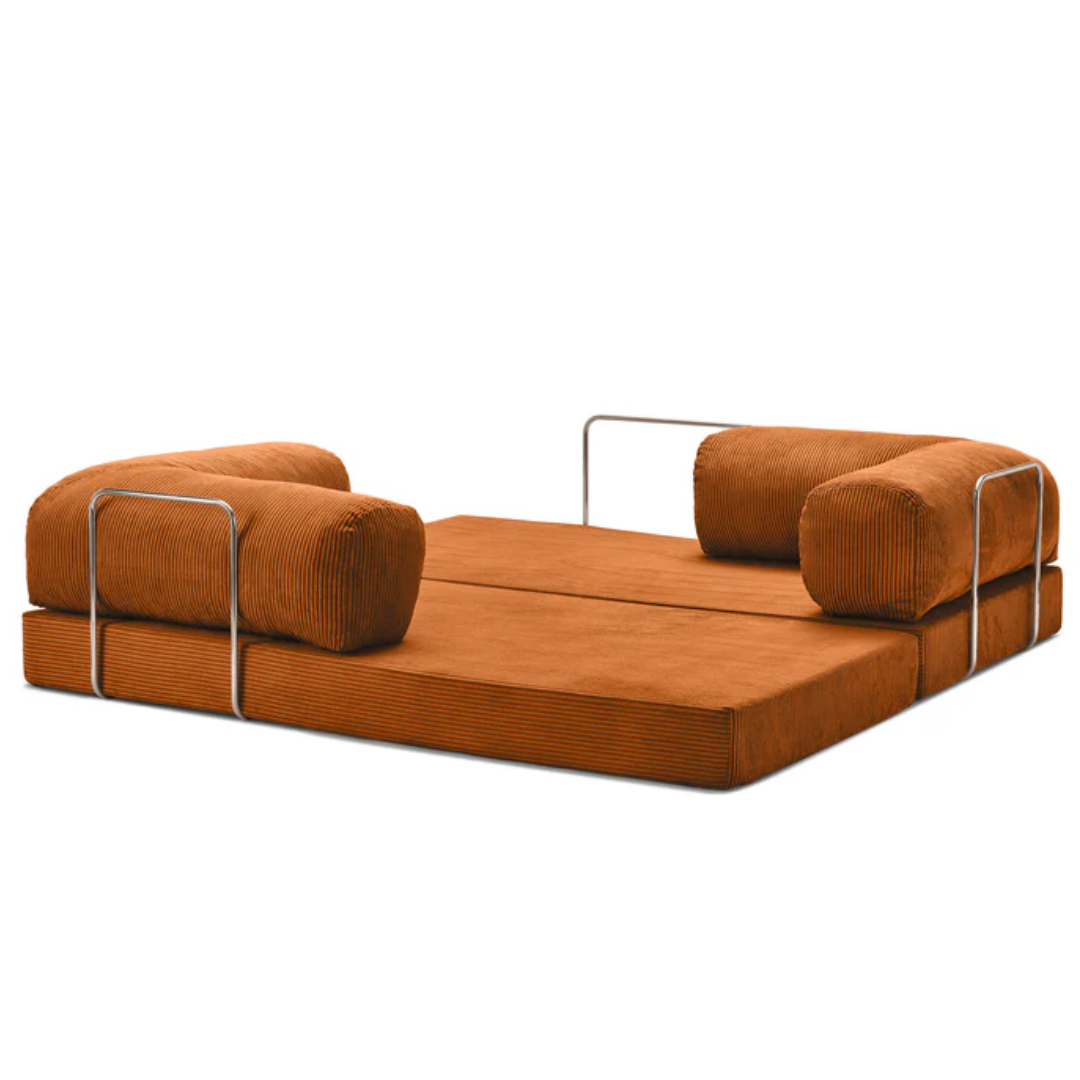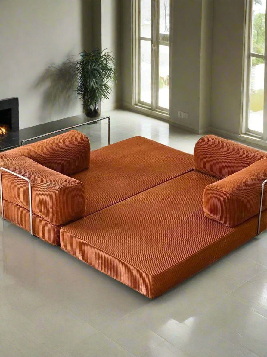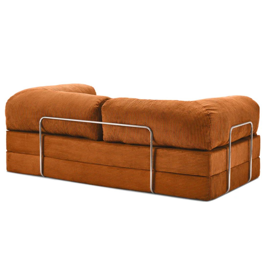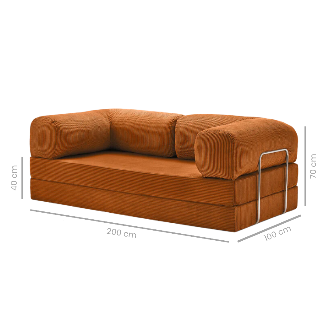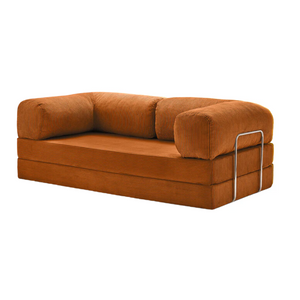 Discover the comfort of our new sofa. designed with a focus on cosy lounging and stylish relaxation. The cushions provide a pillowy softness you'll sink right into. Wrapped in premium corduroy fabric. this sofa combines classic style with robust durability. making it a standout piece in any room. The chrome-plated iron bars add a sleek detail and reinforce the frame for added stability.