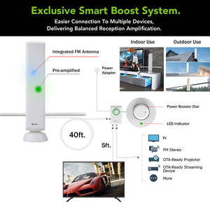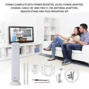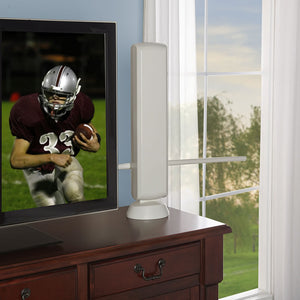 This is the amplified indoor TV antenna that pulled in the most stations and delivered the clearest reception in rural locations, earning The Best rating from The Hammacher Schlemmer Institute. Tested in multiple rural settings, this antenna received 11 stations from at least 35 miles away, far superior to lesser models that pulled in as few as three, or none at all. A built-in amplifier lets you tune signal strength for optimal picture quality and a built-in 4G LTE filter blocks unwanted wireless signals to ensure noise-free reception. Unlike models made with flimsy components, it’s constructed from durable materials for years of reliable use. With up to an 85 mile range. Can also be used outdoors. As with all antennas, reception will vary depending upon the distance from the station’s transmitter, geography, and your home’s construction. Older analog televisions require a digital converter box. Includes VHF signal enhancer rods, 40' and 5' coaxial cables, FM antenna adapter, pole mounting kit, and indoor stand. AC plug. 36" H x 5" W x 4 1/2" D. (3 1/4 lbs.)