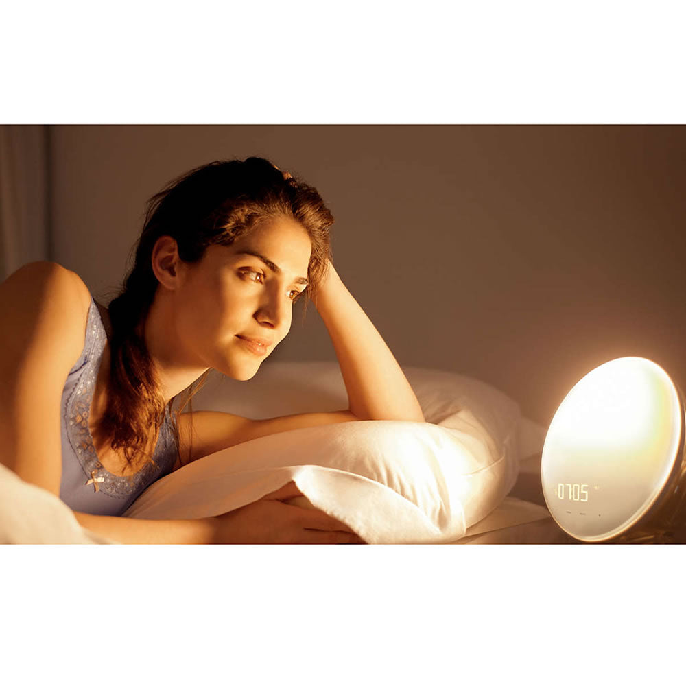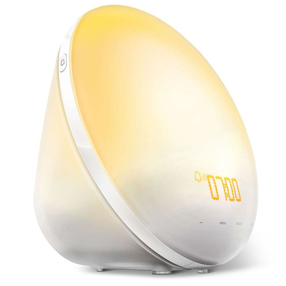 This sunrise simulating alarm clock earned The Best rating from the Hammacher Schlemmer Institute due to its superior performance and ease of use. Unlike lesser models that emitted a jarring bright light when the alarm went off, this unit gradually illuminated a room over 30 minutes, simulating a morning sunrise. It also provided the greatest range of lux in between its settings, spanning from 1 to 326 lux, providing gentle light that progressively filled a room. Rated as one of the easiest units to use, it had a large display that could be effortlessly read in dark or light rooms and simple to follow instructions. With three natural sounding alarms, FM radio, reading lamp, 20 brightness settings, and a snooze button. Clock can also be used at nighttime to simulate a setting sun. AC plug. White. 8 3/4" H x 7 1/2" W x 4 1/2" D. (1 3/4 lbs.)