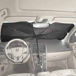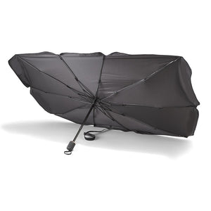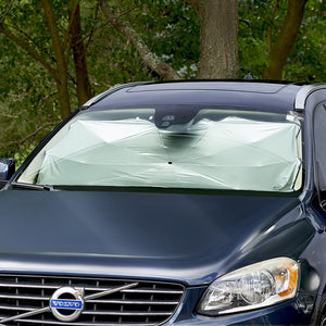 This is the retractable windshield shade that easily opens and closes like an umbrella and stores neatly in a car door or glove compartment. Made of pongee cloth, it has a titanium silver coating that reflects up to 99% of UV rays and provides UPF 50+ protection, reducing the interior temperature of a vehicle and helping prevent fading and cracking of a car’s upholstery and dashboard. It sets up within minutes and unlike similar units that use adhesive or hooks, this shade is held in place via a slip-resistant handle that wedges it in place. When deployed, the shade measures 51-55" W x 31" L and fits most vehicle windshields.