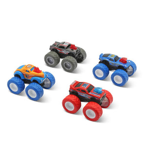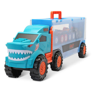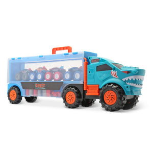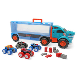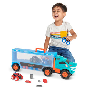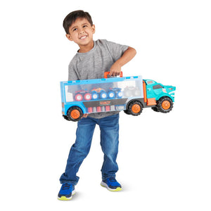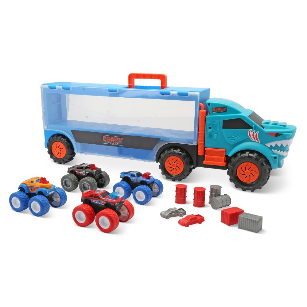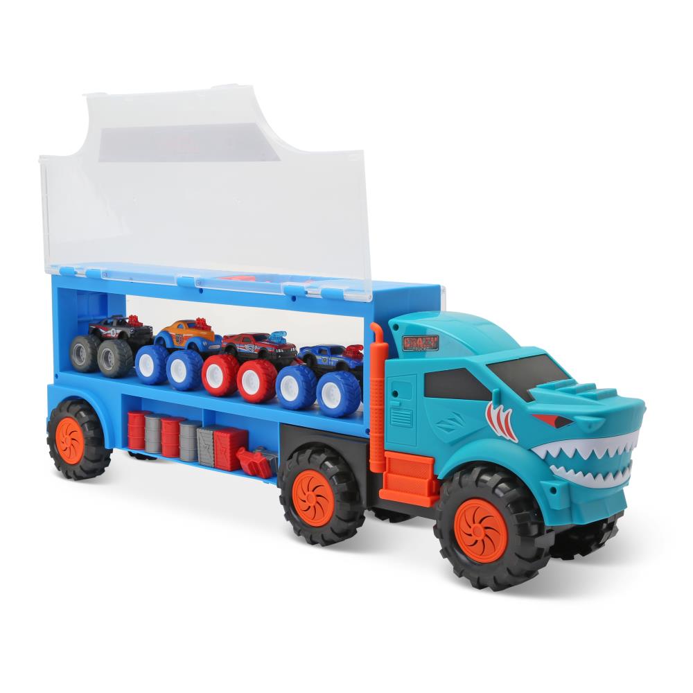 This is the portable hauler that carries and displays four included die-cast metal monster trucks. The rolling six-wheel truck hauler has two clear plastic side panels that flip up to provide access to storage compartments that hold the included trucks and stunt accessories such as barrels and barriers. The four included monster trucks are friction activated and the hauler has a built-in handle for easy transport. Ages 3 and up. 24" L x 5 1/2" W x 8 1/4" H. (1 1/2 lbs.)