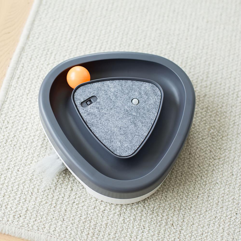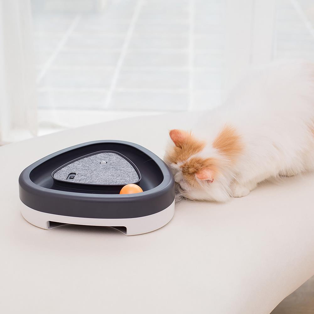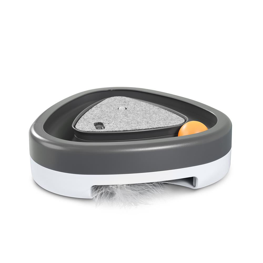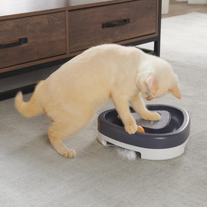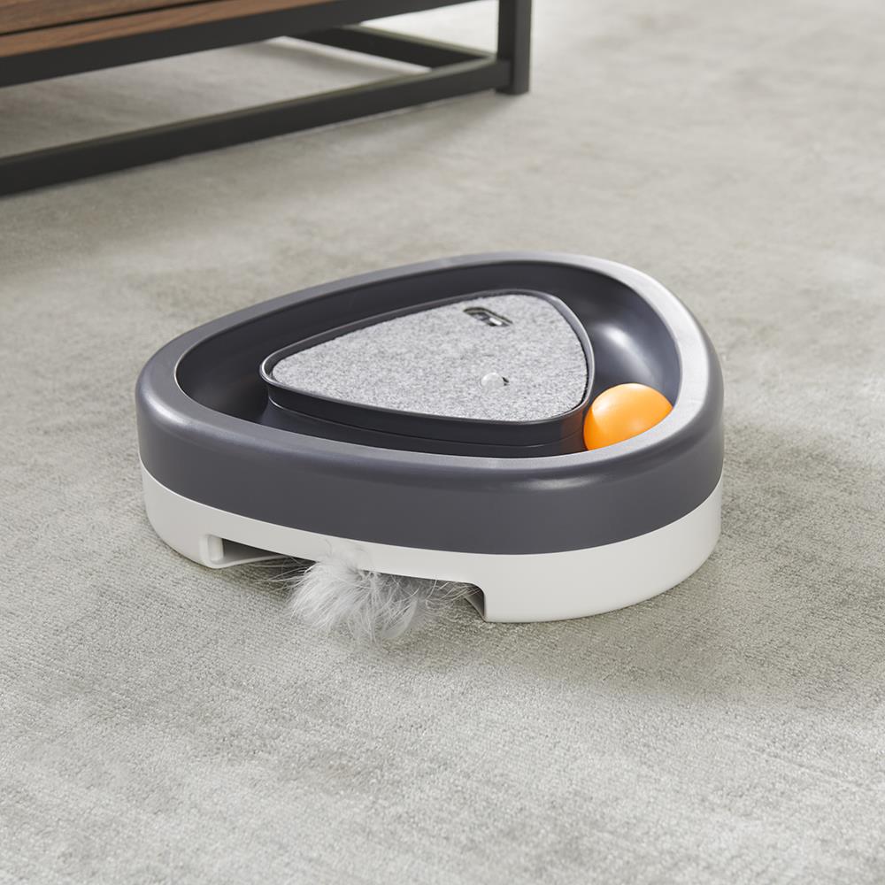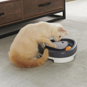 This is the interactive cat toy that taps into a feline’s natural instincts to hunt, pounce, and play. The manual ball at the top moves around the pathway to imitate the movements of a rodent while an elusive feather randomly peeks out from the toy's bottom slots. A built-in sensor activates the feather and a chirping sound if a cat is within 3' of the toy. Besides providing an easy way to keep a feline entertained when its owner is occupied, the device adds much-needed exercise to a cat’s daily routine. With an auto shut-off after three minutes of inactivity. Requires three AAA batteries. 9 1/2" L x 9 1/2" W x 2 1/2" H. (1 lb.)