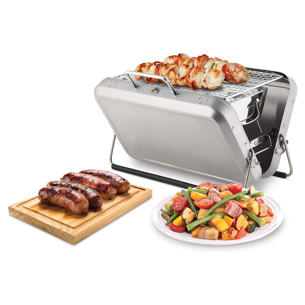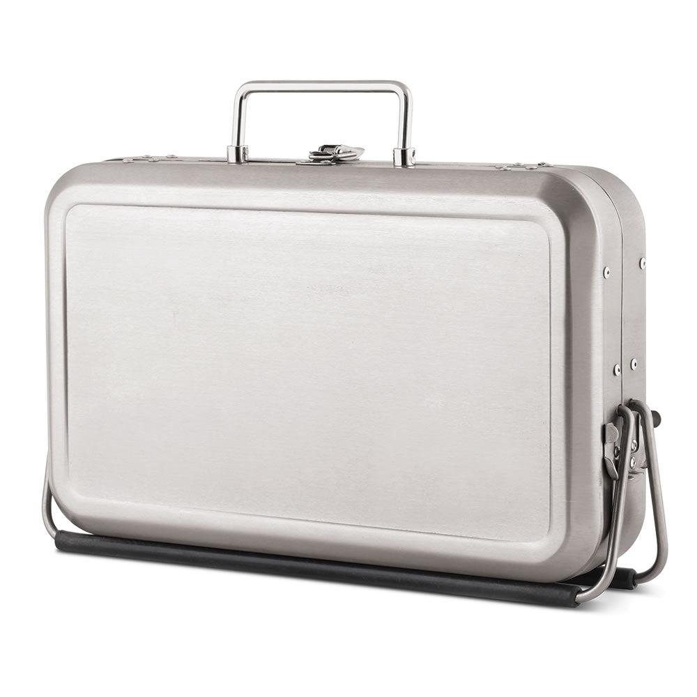 This is the portable charcoal grill concealed within a stainless steel briefcase. This clever case has solved the age-old mystery of how to conveniently transport a grill. Instead of the traditional round camping stove, whose lids always topple off and whose round shape impedes stacking in trunks, this sleek briefcase model is easily carried by its handle and stacked among other camping or tailgating gear thanks to its flat, rectangular design. When unclasped, the case stands up and opens to support a 10" x 6 1/4" metal cooking grate. Long rubberized legs ensure stability, while a removable ash basket catches debris for easy cleanup (without leaving behind evidence of a cookout). 12 1/2" H x 8 3/4" W x 2 3/4" D. (4 lbs.)