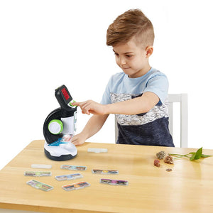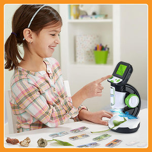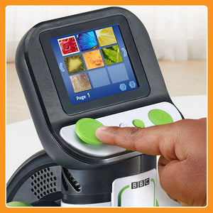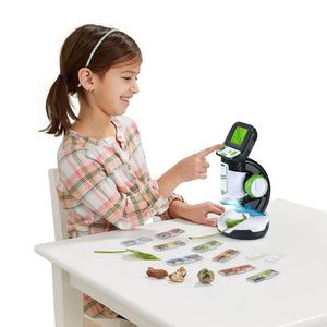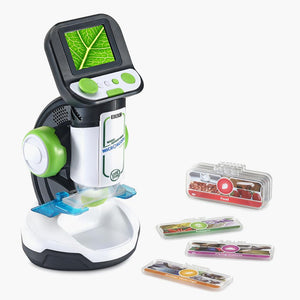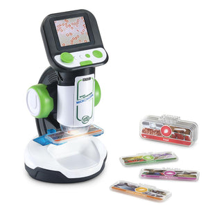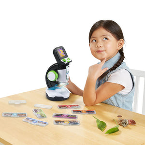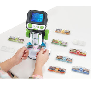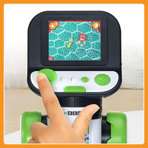This is the interactive microscope that lets young biologists explore the natural world with video-playing slides or their own samples. Eight double-sided smart slides show more than 220 live-action educational BBC videos and images on 15 topics including leaves and flowers, flying insects and crawlers, the human body, food and minerals, and more on the 2.4" viewing screen. Two reusable slides and a tray for larger objects let kids prepare their own samples for viewing at 50-200x magnification. The microscope can store about 100 images in its internal memory and thousands more on a microSD card up to 32GB (not included). Four included adventure games and a quiz game offer budding scientists a fun way to test their knowledge. Includes 4 AA batteries. Ages 5 and up. 9 1/2" H x 5" W x 4 3/4" D. (1 1/2 lbs.)