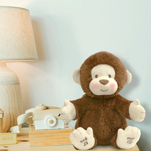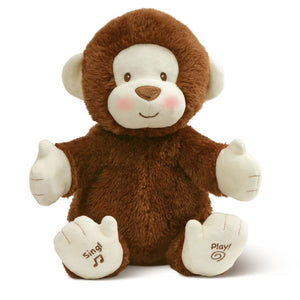 This is the plush monkey who delights babies, kids, and adults with his happy, clappy singing and playing. When the singing simian’s right foot is squeezed, he launches into a 90-second performance of “If you’re happy and you know it” in a child-like voice while clapping his hands. When his left foot is pressed, he plays an interactive clapping game and encourages kids to play along with phrases such as “Clap, clap, clap your hands, clap your tiny hands”. Designed by Gund, providers of plush pals since 1898, this adorable monkey’s soft polyester exterior provides a cuddle-worthy feel for an entire childhood of clapping and hugging. Includes three AA batteries. Ages newborn and up. 14" H x 6" L x 8" W.