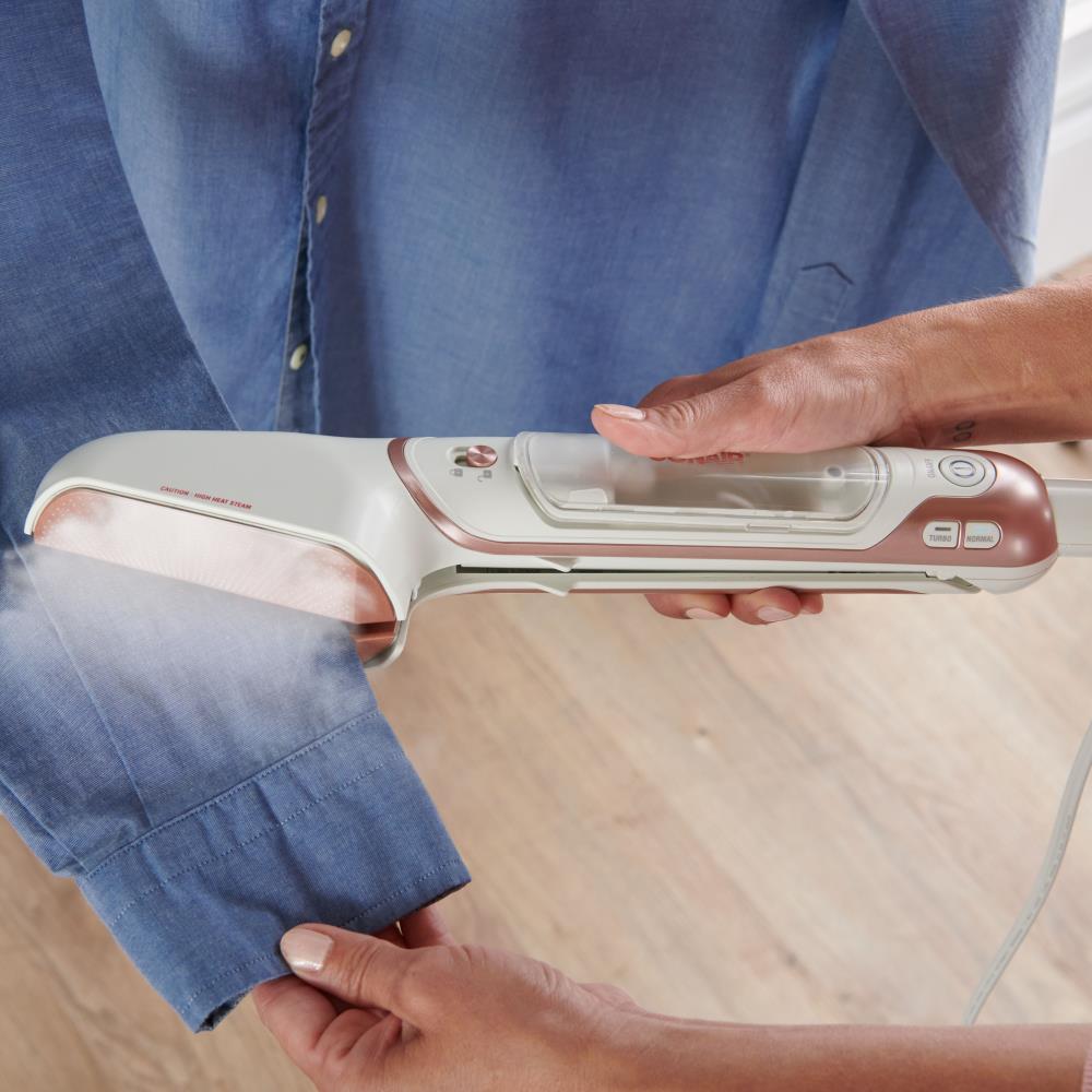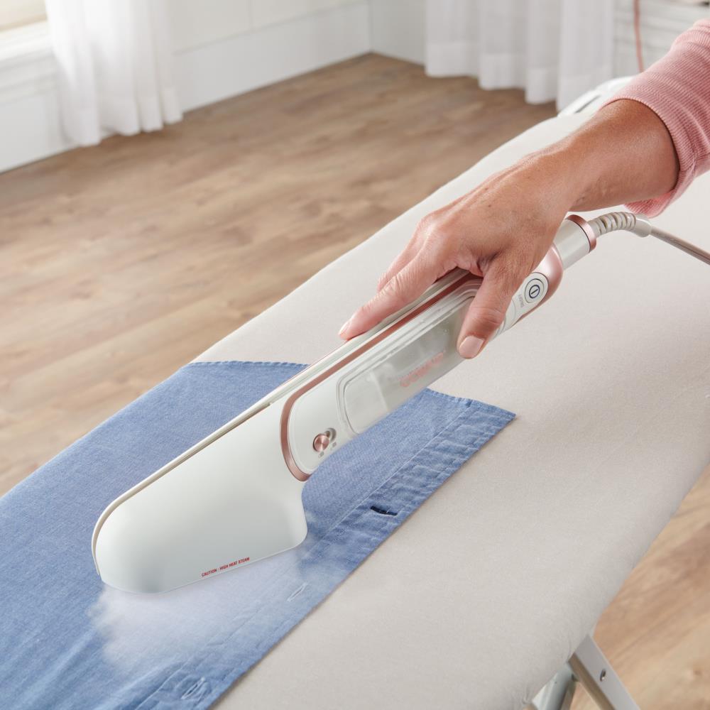This is the 3-in-1 wrinkle eliminator that combines the functions of a clothing steamer, iron, and press. It's uniquely designed to reach all parts of a garment at any angle including hard-to-reach collars, seams, and sleeves. The unit’s easy-gliding plates lock and unlock at the touch of a button, enabling one to switch from ironing, steaming, and pressing in an instant. Its exterior ceramic aluminum plates enable quick ironing and steaming while the interior plates allow for pressing two sides of a garment at once. With two steam settings and a removable 50mL water reservoir. AC plug. 14 1/2" L x 3" W x 2" D. (1 1/2 lbs.)