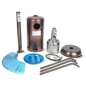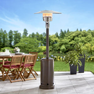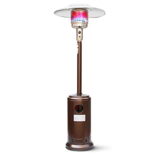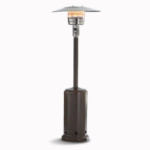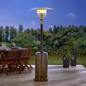 This is the outdoor propane patio heater that delivers up to 46,000 BTU of heat, comparable to those used in commercial settings such as restaurants and hotels. Using a widely available 20-lb. propane tank (not included), the free-standing heater provides 8-10 hours of radiant warmth depending on heat setting. An anti-tilt safety device automatically shuts off the heater if it is tipped over. Its durable steel base has a weatherproof hammered bronze finish that adds a dash of elegance to your patio and wheels that allow for easy mobility. With adjustable heat output, push-button electric starter, and 32" diam. aluminum shield. Includes one AAA battery. Assembly required. 88" H x 32" Diam. (40 lbs.)