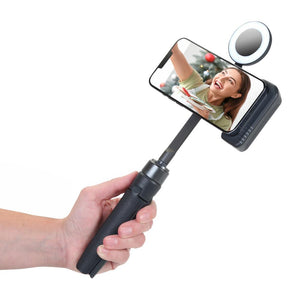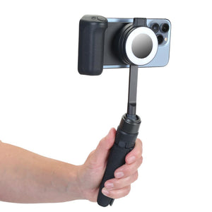 This is the photography kit that turns a standard smartphone into a mobile photography studio. The mount grip secures to any iPhone or Android and lets one hold their device like a standard camera, capturing professional-quality stills and videos. The kit also includes a mini tripod that converts into a selfie stick when needed and an LED ring with a mirror that provides four levels of brightness. The three Magsafe components all snap on and secure together, allowing them to be used all at once or individually. The mount grip also holds a charge, supplying power to your device. Mount and LED ring charge via USB. 3,200mAh.