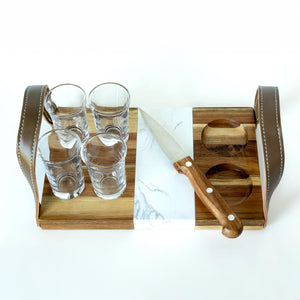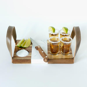 This is the bartop serving set that includes everything needed for a tequila tasting session. The Acacia wood board holds the four included shot glasses and provides two insets—one for lime slices, one for rimming salt. It also has faux leather handles and a built-in marble cutting board that allows a host or hostess to prepare garnishes. The set is completed with a 7"-long paring knife comprised of a 3" stainless steel blade and 4" Acacia wood handle. Board 9 2/3" L x 6 1/4" W x 4" H. (2 1/2 lbs.)