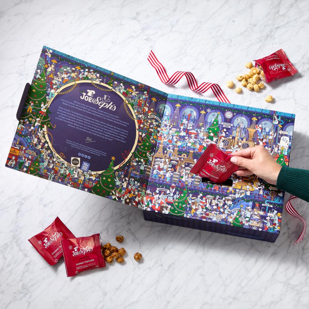 This is the advent calendar that counts down the days to Christmas with 24 servings of gourmet candied popcorn. For two dozen days leading up to December 25th, individuals enjoy 17 different flavors including an award-winning classic caramel popcorn. Additional flavors include caramel and Belgian chocolate, white chocolate, toffee apple and cinnamon, banoffee pie, double chocolate, speculoos, mint chocolate, salted caramel, orange chocolate, vanilla cheesecake, cinnamon roll, apple pie and custard, pumpkin spice, ginger caramel, white chocolate and raspberry, and salted caramel with milk chocolate. Each of the calendar’s perforated doors open to reveal a surprise popcorn treat everyday. Contains milk, soy, eggs, and coconut. May contain peanuts, other tree nuts, and sesame. Box 13 3/4" L x 13" W x 4" D.
