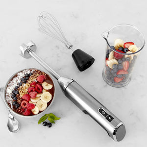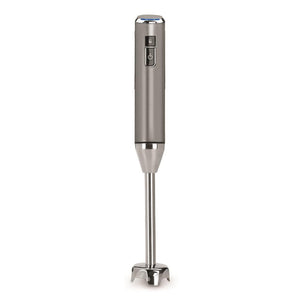 This is the professional grade cordless immersion blender/electric whisk that allows you to conveniently make soups, sauces, smoothies or whip food without being tethered to an outlet. Its motor is powered by a Lithium-ion battery, enabling cord-free use after a full charge. The unit comes with two attachments (blender and whisk) and a 30 oz. mixing/measuring beaker. Charges via USB. Dark Gray. 16 1/4" H x 2 1/2" W x 2 1/2" L. (2 lbs.)