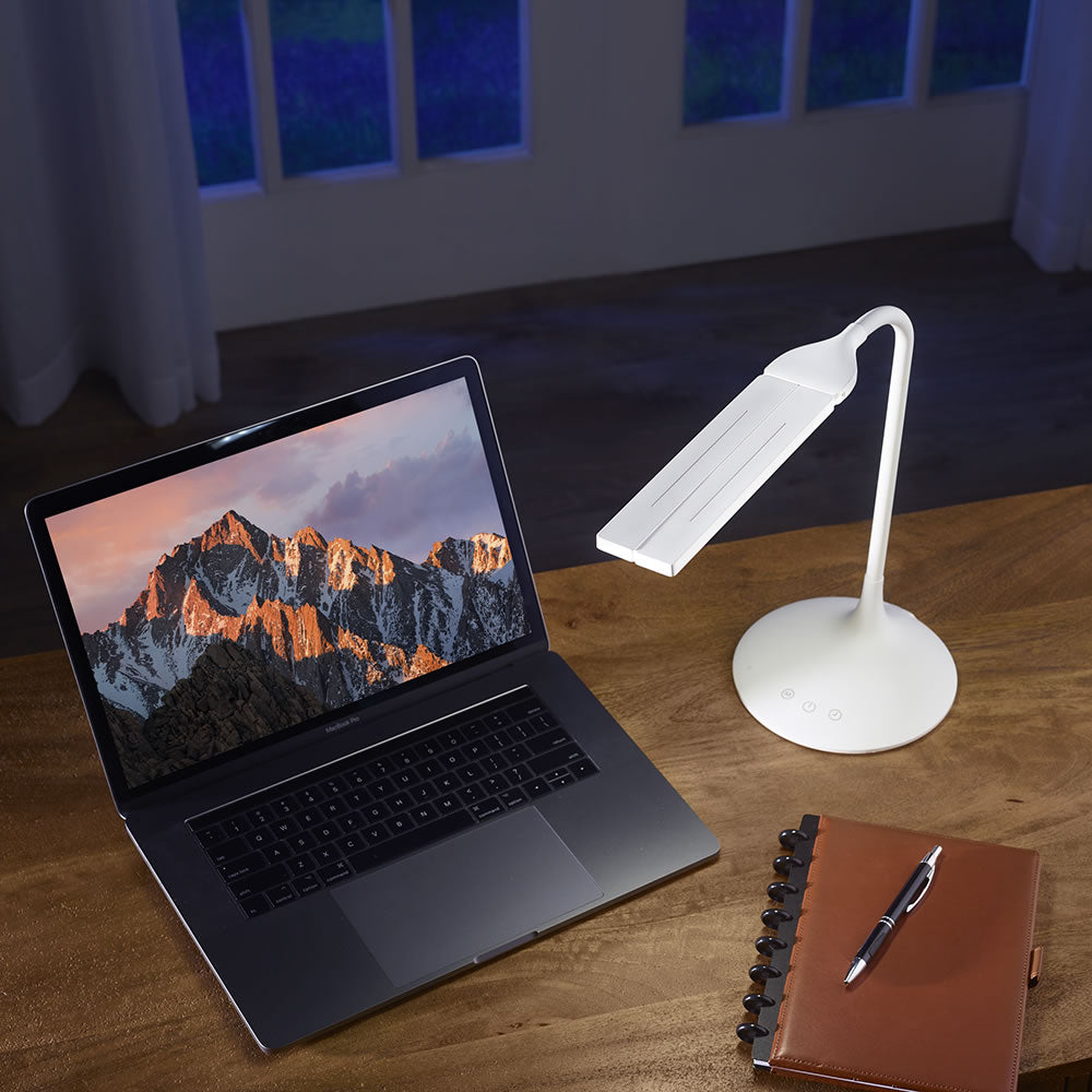 Available exclusively from Hammacher Schlemmer, this is the cordless table lamp with a hinged top that opens to a wide 180° for full desktop illumination. Its unique design lets you direct its 48 LEDs into a concentrated beam or a cone of light. Spanning the light color spectrum from 2,700 to 6,500 Kelvins, its color dimmer modifies the color balance from a soft warm glow comparable to an incandescent bulb to a cool white illumination that simulates natural daylight. A second dimmer controls the lamp’s brightness and a weighted base keeps it balanced. LEDs rated for 30,000 hours. Charges via USB; a full charge provides up to six hours of light on low or two hours on high. 14 1/2" L x 6 3/4" W x 1" D. (1 lbs.)
