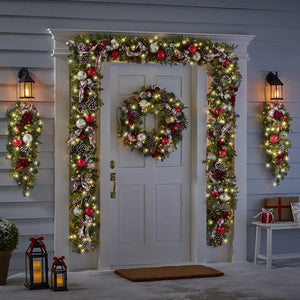 Available only from Hammacher Schlemmer, this is the cordless prelit holiday trim reminiscent of the rich burgundy-and-alabaster decor of a French country chateau. The trim may be draped indoors or outdoors under the shelter of a roof overhang, with no outlet required and without the unsightly tangle of extension cords. The wreath, garland, and sconce are decorated with burgundy- and white-painted segmented, textured ornaments with a pleasing assortment of finishes. Warm white LEDs lend a rich glow to each piece of trim. An automatic timer turns the LEDs on for six hours and off for 18 hours. Includes remote. The wreath and garland require three D batteries each; the sconce requires two D batteries.30" Wreath. 90 LEDs; 98 tips.