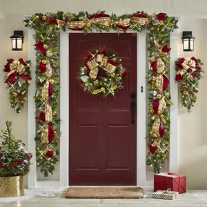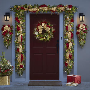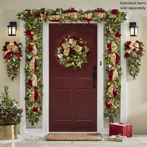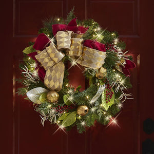 Available only from Hammacher Schlemmer, this is the regal ribbon cordless prelit holiday trim that can be hung anywhere indoors or outdoors without requiring proximity to an outlet. Its two-tone gold diamond-patterned fabric ribbon originates from the 13th-century law established by Louis IX that reserved the precious gem for the king while the rich velvety crimson companion ribbon provides tasteful contrast. The wreath, garland, and sconce are decorated with glossy, golden-painted plum ornaments accompanied by clusters of red berries that nestle among dense greenery that replicate the growth patterns of actual conifer branches. An automatic timer turns the warm white LEDs on for six hours and off for 18 hours. Each piece of trim requires three D batteries.Wreath. With 60 LEDs. 26" Diam. x 6" D. (41/4 lbs.)