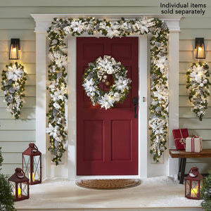 Available only from Hammacher Schlemmer, this is the prelit holiday trim that celebrates the season with the beauty of a snowy winter forest. Each piece is adorned with white poinsettias, ornament globes, painted pinecones, and a decorative bow set among faux greenery that replicates real conifer branches. The trim can be hung anywhere indoors or outdoors (covered) without requiring access to an outlet while its warm white LEDs cast light on a wall, doorway, mantel, or banister. An automatic timer turns the LEDs on for six hours and off for 18 hours. Wreath. With 80 LEDs and 139 PE/PVC tips. Requires three D batteries. 30" Diameter x 6" D. (5 lbs.)