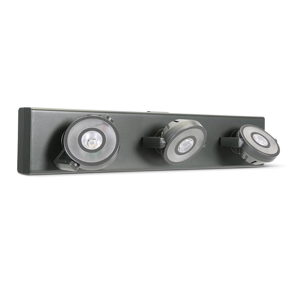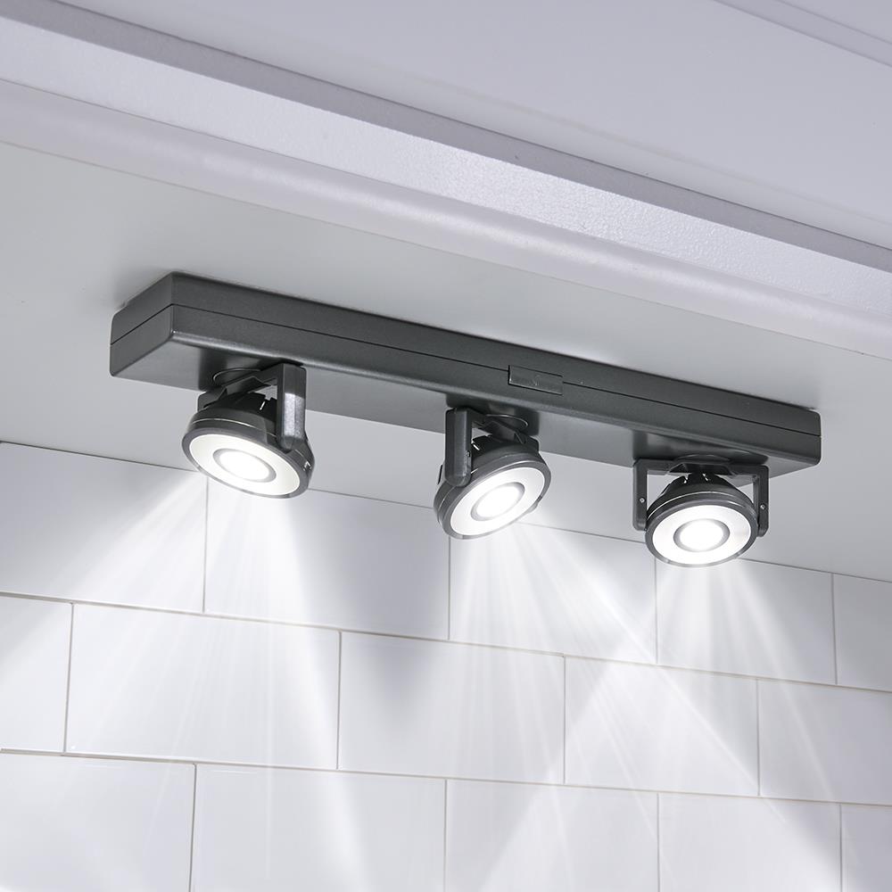 Available only from Hammacher Schlemmer, these are the under cabinet LED lights that swivel and pivot to cast light in any direction. Requiring no hardwiring to install, the battery-powered unit contains three lamp heads that rotate left or right 330º and pivot up or down to direct light over your preferred area. Ideal for kitchen cabinets, bookshelves, or workbenches, each lamp contains three LEDs that provide a color temperature ranging from 2900-3100 Kelvin. With a dimmer switch. Includes mounting hardware. Each unit requires six AAA batteries. Set of two units. Black. 12 1/4" L x 2 1/4" W x 2 1/4" D. (10 oz.)