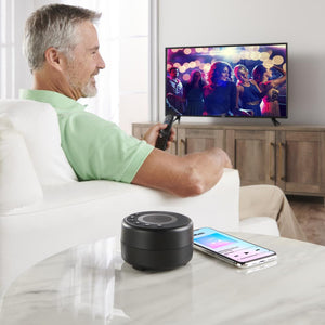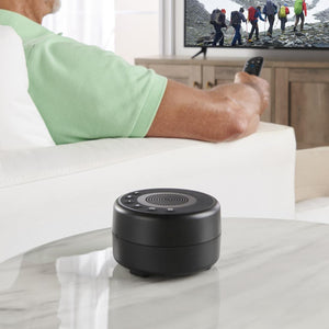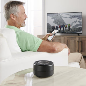 This is the portable Bluetooth speaker that clarifies sound from a television to help viewers hear dialog more clearly. It uses proprietary technology that isolates voice frequencies, lifting dialog audio without increasing a program’s background noise or music. It effortlessly pairs with a television, smartphone, tablet, or laptop within a 33' range, and easily fits into a backpack or suitcase for travel. With a built-in microphone for handsfree phone calls and an adjustable volume. Charges via AC; a full charge provides 30 hours of power. 4" diameter x 2 1/4" H. (14 1/2 oz.)