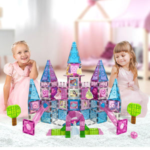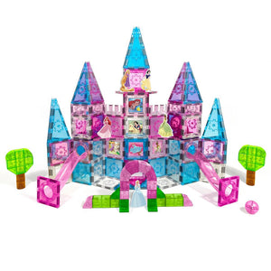 This is the set of colorful magnetic tiles that lets children build their own Disney princess castle. Using a collection of squares, triangles and other geometric shapes embedded with magnets, young Disney fans can use the instructions to build the displayed castle, or construct their own princess-inspired creations. Includes five princess characters (Ariel, Snow White, Rapunzel, Tiana, Cinderella), 97 tiles, 44 cubes, 18 marble pieces, and an instruction booklet. Ages 3 and up.