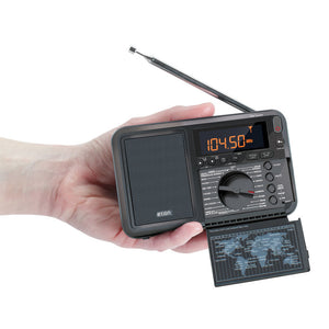 Without the static common to lesser models, this pocket radio picks up AM and FM stations with crystal clear clarity—even while in motion. Its 50mm speaker generates 83.3 dB of crystal clear sound at its highest volume, making for easier listening. Easy to use, it provides 500 presets and has simple tuning and volume dials. Its backlit LCD panel displays station numbers, time, and radio data received from FM stations. It has an alarm with snooze, sleep timer, 3.5mm earphone jack, and built-in FM telescopic antenna. Also receives Longwave and Shortwave radio transmissions. Includes a black leather case—only available from Hammacher Schlemmer. Requires four AA batteries. 5 1/4" W x 3 1/2" H x 1 1/4" D. (8 oz.)