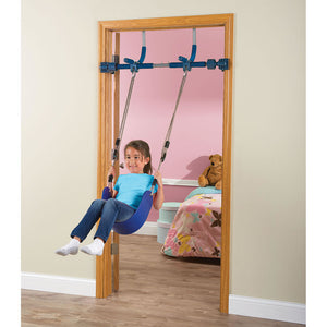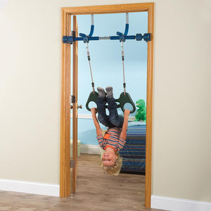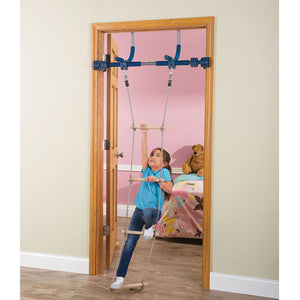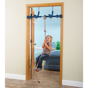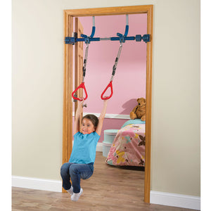 This is the doorway jungle gym that enables children to climb, swing, and play within the comfort and safety of home. It securely mounts to the molding of door frames 25" to 36" wide without nails, bolts, or screws, and features patented vice grips that enable safe swinging motions. Designed to withstand the pent-up energy of a child stuck inside on a rainy day, it includes a swing that attains ceiling-skimming heights, a pair of rings and a trapeze bar for acrobatic feats, and a climbing rope and ladder. Its support bar is made from the same lightweight steel used in aircraft construction and supports up to 300 lbs. Ages 3 to 12.