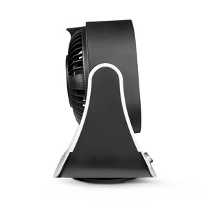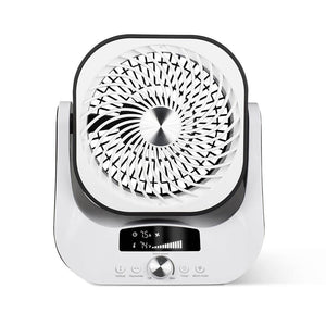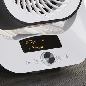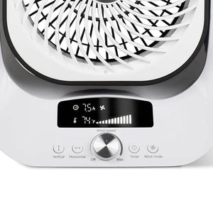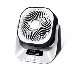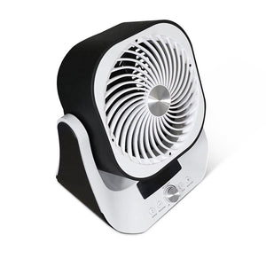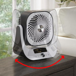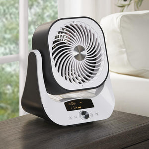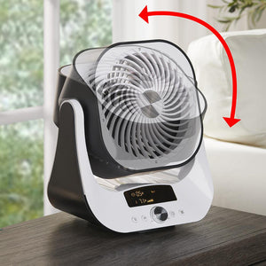 This is the tabletop air circulator that provides 12 speeds, vertical and horizontal oscillation, and whisper-quiet operation. It pivots 90° up/down and 60° side-to-side while two counter-rotating fans inside provide four wind modes along with its 12 fan speeds that operate between 300-1,850 rpms. Wind modes include natural (circulating air to stimulate a natural breeze), sleep (gradually slows as one falls asleep), Eco (circulates air based upon ambient temperature), and normal (per set fan speed). Operates at a quiet 30-58 decibels. With timer that turns the fan off after 71/2 hours. 14" H x 11 3/4" W x 9 3/4" D. (5 lbs.)