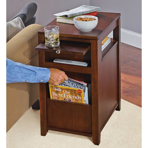 Offered only by Hammacher Schlemmer, this is the side table designed specifically for reclining chairs that provides easy access to items whether one is sitting upright, or partially/fully reclined. The table is hand-built from pine and engineered wood into a clever configuration that includes trays, cabinets, racks, a cubbyhole, and a shelf accessible from any seated position. The front provides a slide-out tray for snacks and drinks while a lower cabinet with two shelves and an integrated rack stores magazines and newspapers. The rear has its own slide-out tray, an upper cubbyhole for reading glasses, and a lower rack for accessing reading materials while reclining. A recessed shelf beneath the top provides access from either side. Assembly required. Dark Brown. 26" H x 14" W x 20" D. (41 3/4 lbs.)