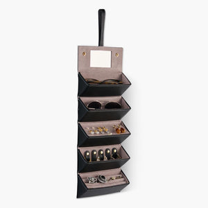 This is the travel organizer that provides optimal storage for eyeglasses, sunglasses, and jewelry. Crafted from vegan leather, it has five velour-lined compartments—two for eyewear, one for earrings, one for bracelets and necklaces, and one that contains three ring rolls. The case rolls up for travel to about the size of a clutch purse, enabling it to easily fit in a carry-on. Select Black, White, or Pink. Open 1 71/2" L x 6 1/2" W x 2" D, closed 6 1/2" L x 5" W x 5" D. (12 oz.)