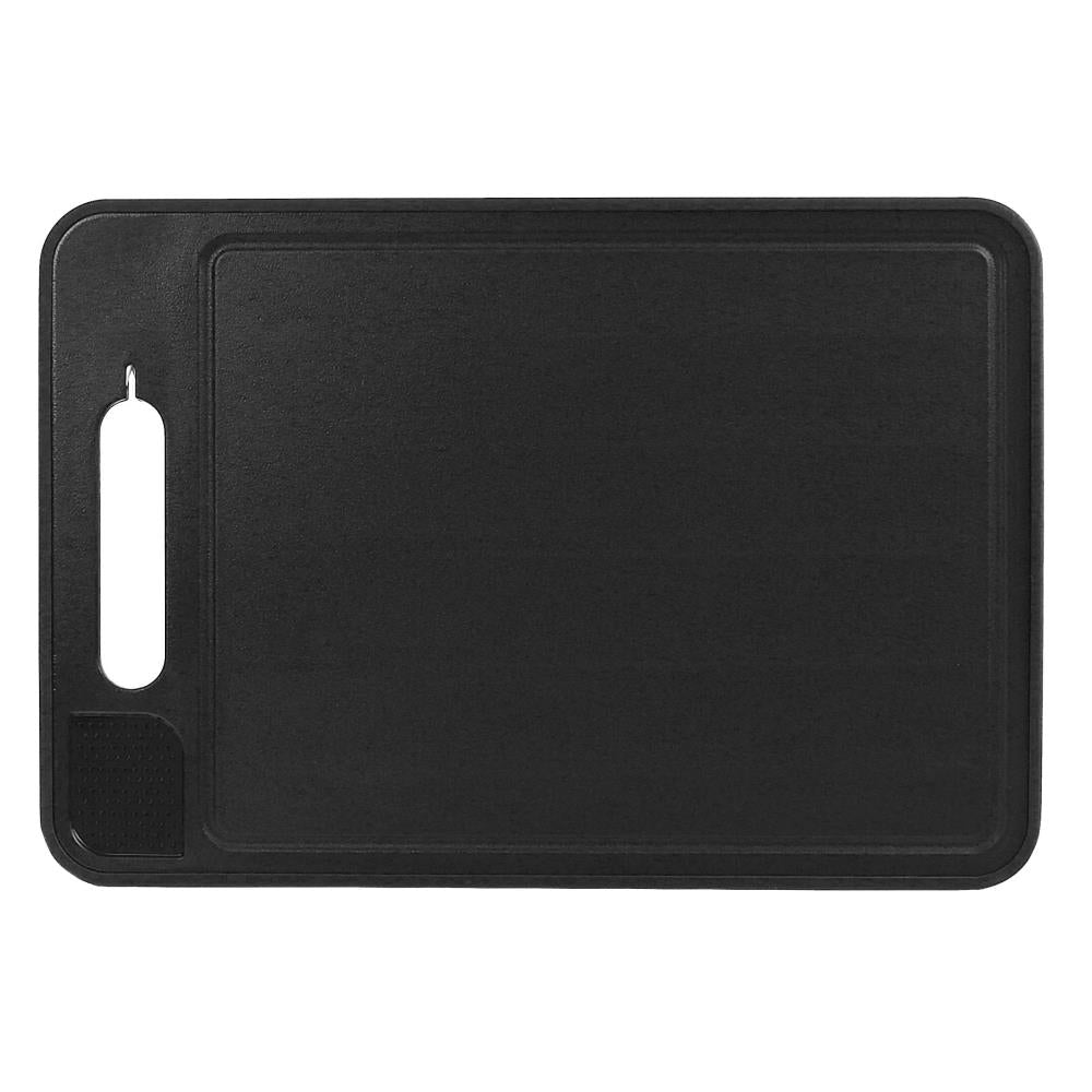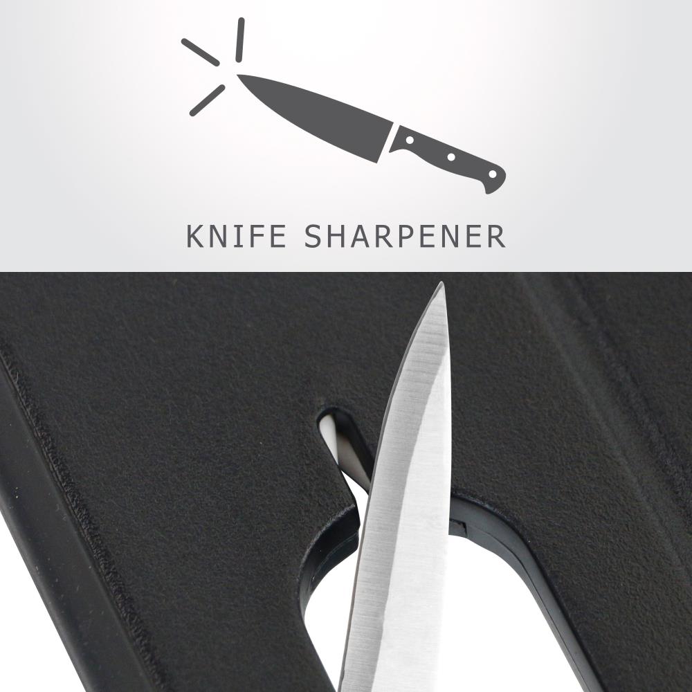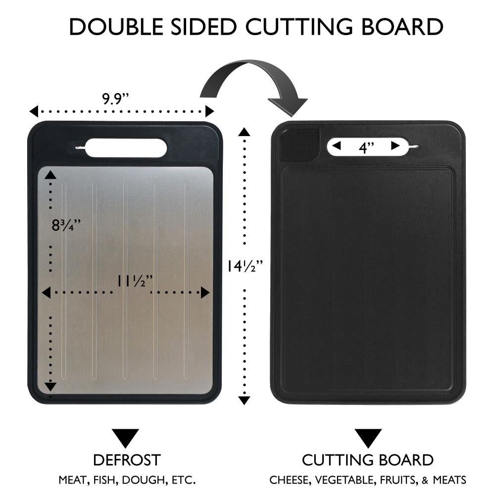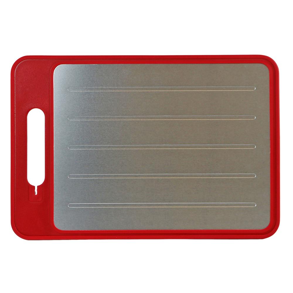 This is the thawing tray that safely defrosts meat up to 50% faster than traditional methods. It operates without batteries, harsh chemicals, or an external power source for an quick, even thaw on the countertop using premium aluminum alloy that draws ambient warmth to the surface for a process that is more sterile than soaking in cold water and gentler than microwaving. The reverse side of the tray functions as a polypropylene (food-safe plastic) cutting board with a juice groove and rubber edges. The board side also contains a ceramic knife sharpener and zester. Black or Red. Overall 14 1/2" W x 10" L x 3/4" D. (1 1/2 lbs.)