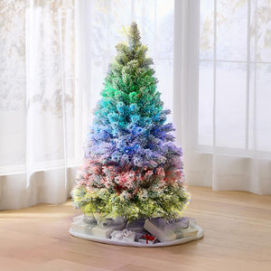 Only available from Hammacher Schlemmer, this is the flocked, 4 1/2'-tall fiber optic Christmas tree that creates a dancing cascade of colors along its branches. Using 39 LEDs to illuminate 276 fiber-optic tips, the tree lights a room with an auroral effect that displays an array of bright holiday colors in 23 different synchronized patterns. The controller enables one to easily select a lighting option, cycle through each mode, and set the timer to turn the tree on for eight hours and off for 16 hours. Its branches are delicately flocked to recreate tiny crystals of snow and ice and its PVC tips hold their shape and accommodate other decorations including bulky ornaments. The tree is comprised of two sections that simply stack and lock into place for ease of setup and rests on the included metal stand. AC plug. 54" H x 30" Diameter. (15 lbs.)