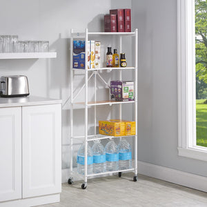 This is the portable pantry that provides additional storage yet easily rolls away and folds flat when not in use. The one-piece frame expands or folds without requiring the use of tools, enabling fast, simple set up and convenient storage. It has five metal shelves (with four wood inlays) that store spices, snacks, or other kitchen and cooking essentials. Unit supports up to 100 lbs. Rolls on four casters (two locking). No assembly required. White. Open 56" H x 24 1/4" W x 10 3/4" D. (17 lbs.)