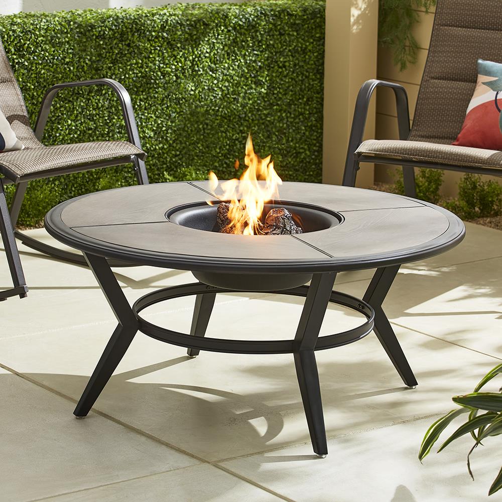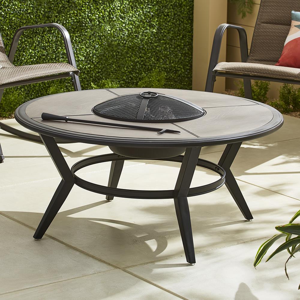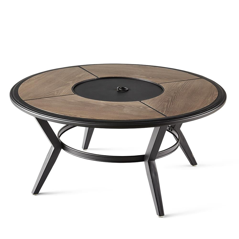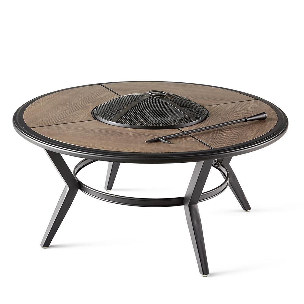 Available only from Hammacher Schlemmer, this is the patio table with an integrated wood-burning fire pit that provides both entertainment options year-round. Made with a powder-coated steel frame in black that blends into an outdoor space, the table has a top made from four curved metal tile sections that look like smooth wood with a fifth circular section that fits over the fire pit to provide a finished look for warm weather entertaining. When cooler evenings arrive, the center section removes to provide access to the 5 1/2"-deep x 17"-diam. fire pit. Comes with screen for blocking sparks. 42" diam. x 19" H. (44 lbs.)