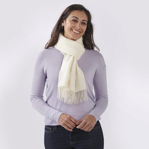 This is the scarf made in Peru from 100% baby alpaca yarn, the iconic natural fiber prized for its lightweight warmth, softness, and durability. Highly sought around the world, warmer than sheep’s wool, and more luxurious than cashmere, the incredibly fine fibers of the Peruvian alpaca fleece have a silky hand, with a touch almost like velvet. The finish is less itchy than other coarser wools, resulting in a scarf that is comfortable for all-day wear. Hand wash and hang dry or dry clean. Imported. Silver, Sage, Ivory, Black, or Periwinkle. One size fits most.