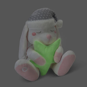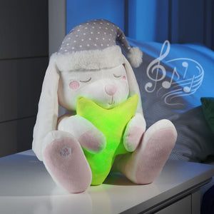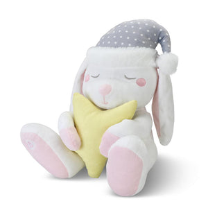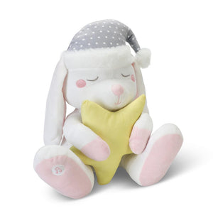 Available only from Hammacher Schlemmer, this is the plush bunny that plays a soothing lullaby to help little ones fall asleep. The snuggly stuffed animal holds a glow-in-the-dark star that casts gentle ambient light. The adorable bunny’s soft polyester exterior provides a cuddle-worthy feel for an entire childhood of nighttime hugs. Includes three AA batteries. Ages 3 and up. 12" H.